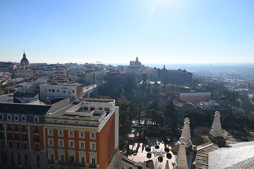 Vuonna 1953 valmistunut nykyinen Riu-hotellin rakennus on yksi Madridin näkyvimpiä maamerkkejä. Nousemme aterian jälkeen tihkusateiselle kattoterassille, josta saa ihailla Madridia kaikkiin ilmansuuntiin. Upeat näköalat sykähdyttävät säästä huolimatta. Suosituin kuvauspaikka vaikuttaa olevan lasilattia, jolle on pitkä jono. Jätämme tämän kokemuksen väliin, mutta rohkeuttaan voi koetella myös terassin toiselta puolelta löytyvällä lasisillalla. Katu näyttää olevan sen läpi katsottuna kovin kaukana alhaalla.