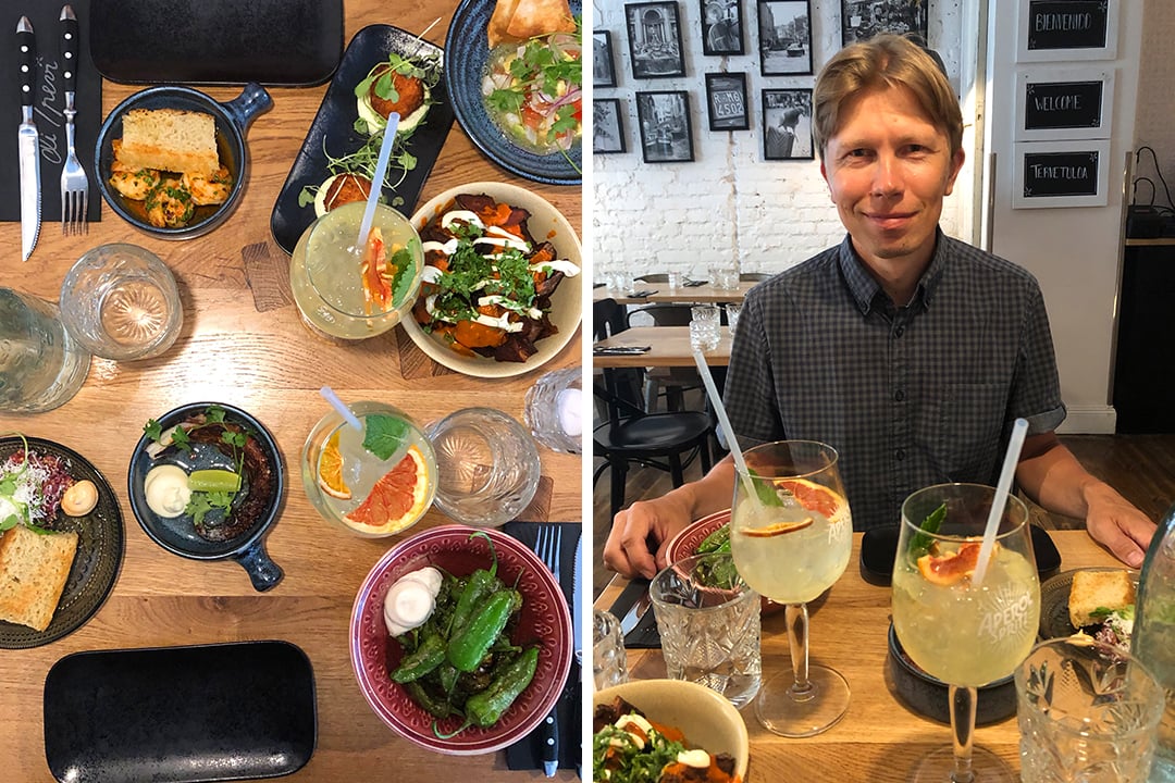 Siinä missä Sergio’s vei makumatkalle Italiaan, johdatteli Di Trevi nimestään huolimatta paremminkin Espanjaan. Runsas tapas-lounas sopi täydellisesti päivämme ohjelmaan. Pöytään kannettiin kaikkiaan seitsemän annosta, joihin kuului muun muassa mustekalaa, katkarapuja, arancineja, pimientos de padrón -paprikoita sekä tartaria. Totesimme kaikki maut erinomaisiksi, vaikka henkilökohtaisissa suosikeissa olikin vaihtelua. Tarjolla olisi myös pääruokia ja pizzaa, mutta tässä ravintolassa houkuttelee nimenomaan kunnon tapas-valikoima. Di Trevi tuntui harvinaisen rennolta paikalta, jonne voisi tulla isommallakin porukalla nauttimaan maailman mauista ja raikkaista juomista.